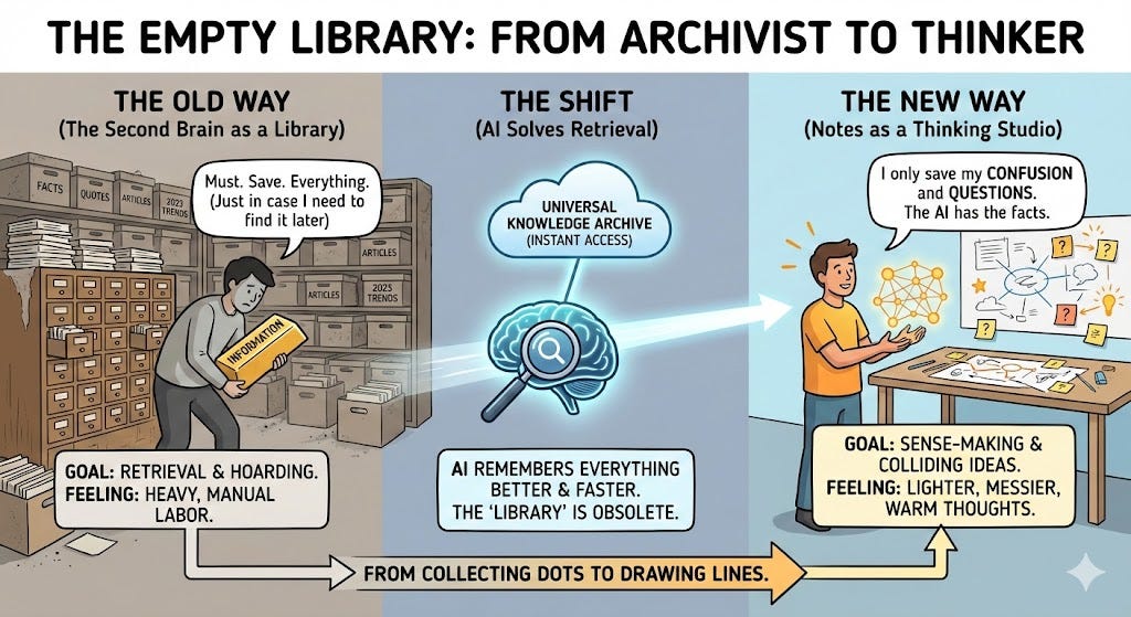 For a long time, we were told that being productive meant acting like a librarian. We collected information. We organized it. We treated facts like gold bars that we had to hoard.